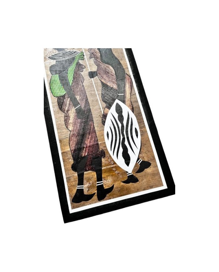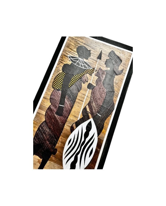 This stunning variation of our classic Maasai couple artwork combines natural banana fiber with bold East African textiles. The piece depicts a Maasai warrior holding an intricately patterned decorative shield, while his partner stands beside him, carrying a baby on her back wrapped in colorful kitenge fabric—a vibrant, traditional East African print known for its bright patterns and cultural significance.