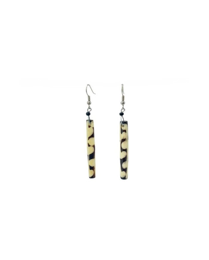 Discover the Nguzo Batik Bone Earrings, a stunning representation of Kenyan craftsmanship. Handcrafted from natural cow bone, these rod-shaped earrings showcase intricate batik patterns created using traditional dyeing techniques. Each pair is unique, reflecting the skill and artistry of local artisans.