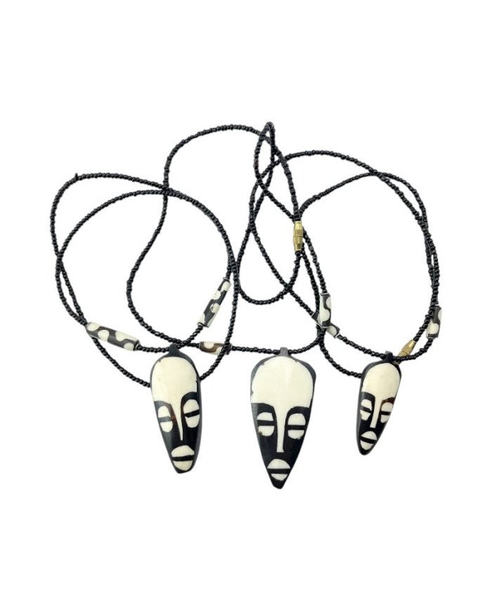 The Uso Pendant Necklace is a vibrant and unique piece of handmade African jewelry, thoughtfully crafted by skilled Kenyan artisans. This African necklace showcases black Maasai beads complemented by two batik-dyed tube cow bone beads, adding color and texture to the design. At its center is a batik-dyed cow bone pendant featuring a tribal mask design, symbolizing cultural heritage and protection. The intricate mask design, combined with the colorful batik dye, creates a striking contrast, making this necklace an eye-catching statement piece. Ideal for those who appreciate bold, nature-inspired jewelry with deep cultural significance.