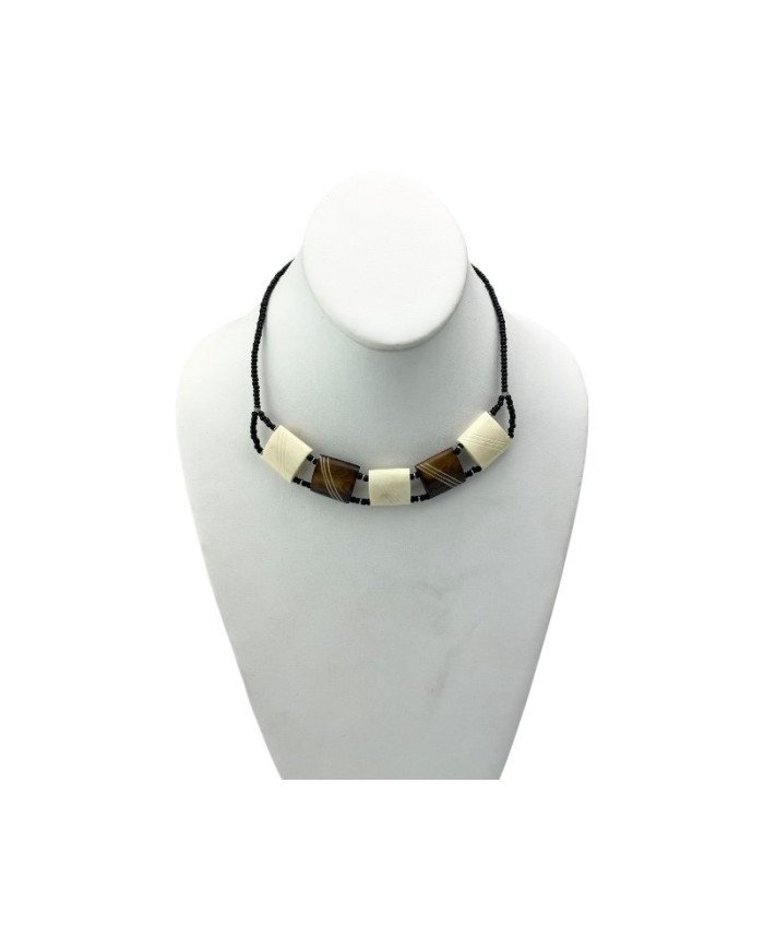The Shupavu Cow Bone Necklace is a stunning representation of Kenyan artistry, expertly crafted for those who appreciate unique handmade jewelry. This exquisite necklace features five square cow bone beads, where three beads maintain a natural white color, and two are dyed a soft light brown, each adorned with three elegant diagonal etchings. Complemented by chic black Maasai glass beads, this African necklace offers a beautiful blend of colors and textures. Perfect for both casual and formal occasions, the Shupavu Cow Bone Necklace is a statement piece of African jewelry that celebrates cultural heritage and artistry.