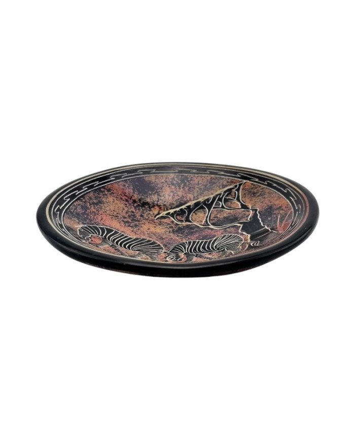 Celebrate the spirit of the African savannah with this beautifully hand-carved decorative dish, made in Kenya from natural Kisii soapstone. This piece features two graceful zebras beneath a tree, evoking the peaceful rhythm of life in the wild.