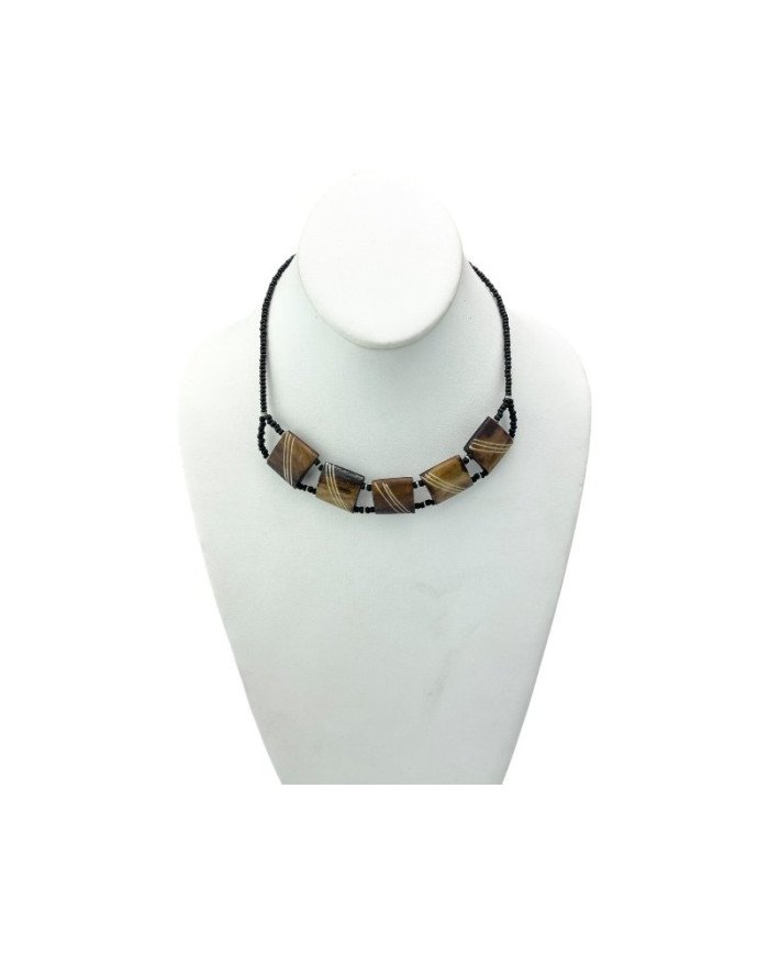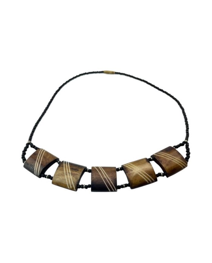 The Inawezekana Cow Bone Necklace is a classic piece of handmade African jewelry that captures the essence of Kenyan artistry. This exquisite necklace is crafted with five square cow bone beads, each dyed a warm light brown and etched with three elegant diagonal lines. Complementing these unique beads are black Maasai glass beads, adding depth and character. Perfect for everyday wear or special occasions, the Inawezekana Cow Bone Necklace celebrates tradition and individuality, making it a must-have handmade accessory for those who appreciate distinctive craftsmanship.