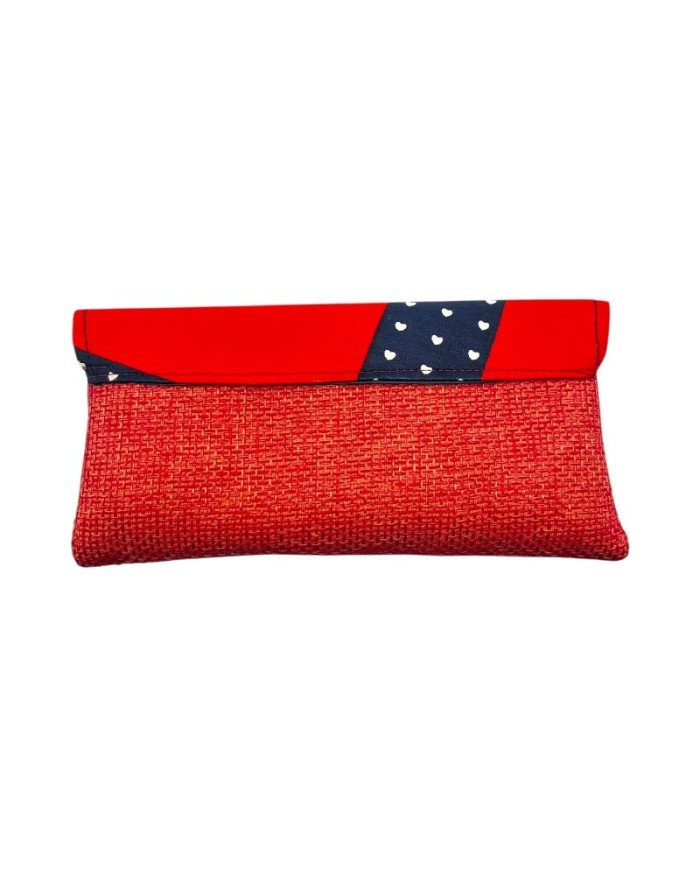 A handmade orange jute clutch with a colorful kitenge flap, lined interior, zip pocket, and magnetic closure—bold, warm, and unique.