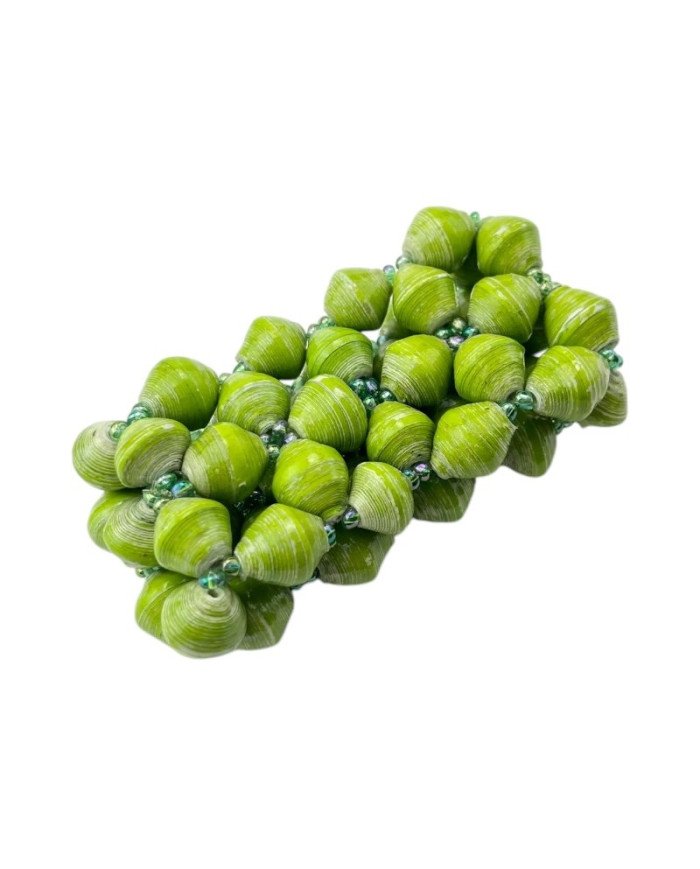 The Pamoja Paper Bead Bracelet -Green is a striking and eco-conscious piece of African jewelry crafted from solid color Ugandan recycled paper beads paired with matching glass beads. The design showcases a sleek, monochromatic look, where the vivid hues of the paper beads are complemented by the smooth texture of the glass beads, creating a harmonious and bold statement piece. This stretch cuff bracelet is easy to wear and offers a comfortable, snug fit. A perfect choice for those who love minimalist yet colorful accessories that reflect both sustainability and style.