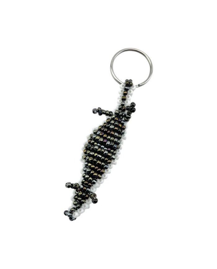 Add a wild touch to your keys or bag with this Maasai Bead Crocodile Keychain, handmade in Kenya using iridescent Maasai glass beads strung on clear nylon line. The crocodile’s form is accented with white beads along the sides and finished with bold red or orange beads for the eyes, giving it a distinctive and playful personality. Lightweight and durable, this flexible keychain is a unique cultural gift or souvenir representing African wildlife.
