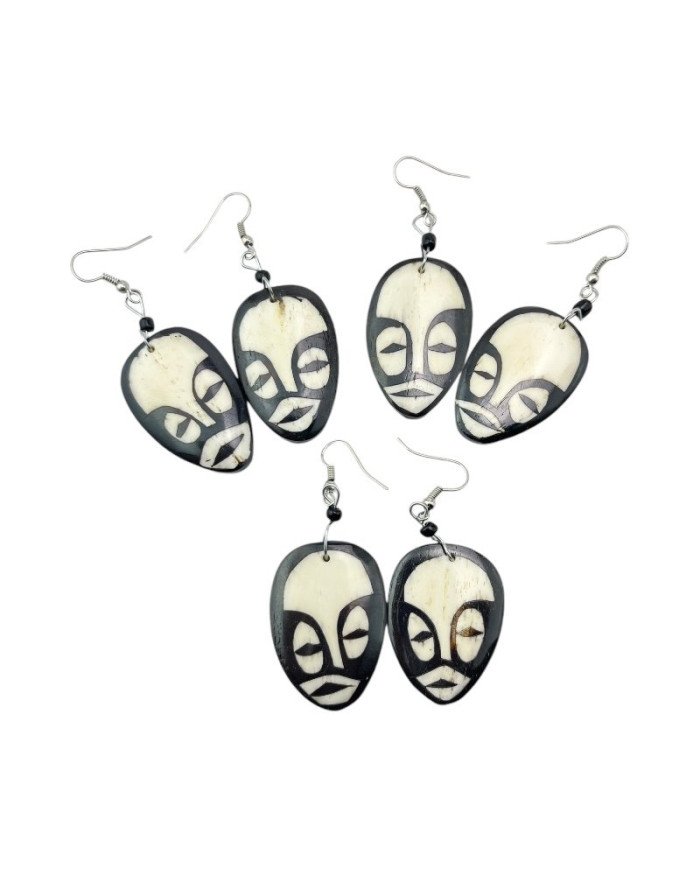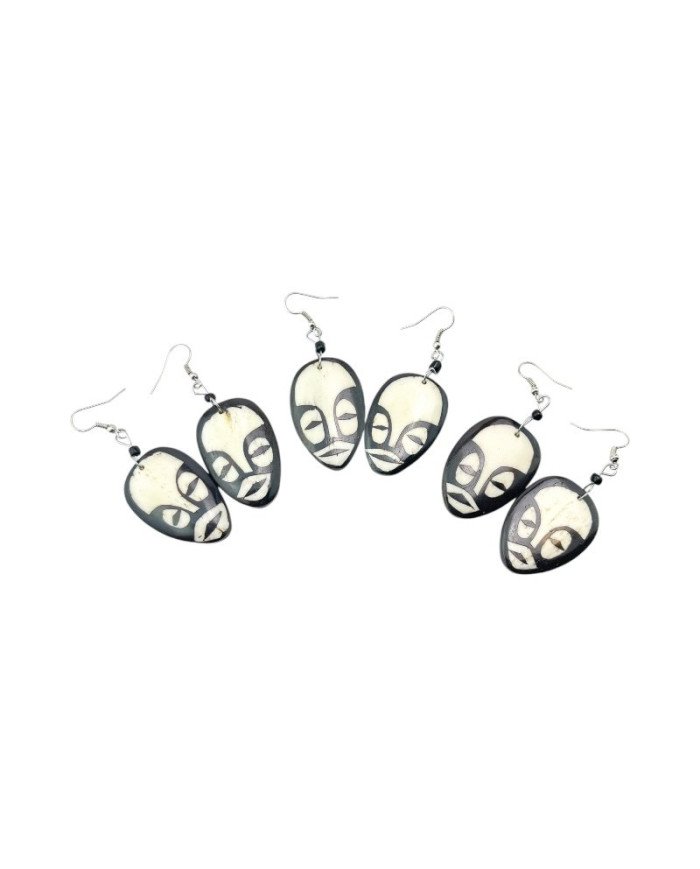 Introducing the Barakoa Bone Earrings - Large, an exquisite example of Kenyan craftsmanship. Handcrafted from natural cow bone, these African earrings showcase an intricate mask print created using a traditional wax-resist dye technique. Each pair is unique, highlighting the skill and artistry of local artisans.