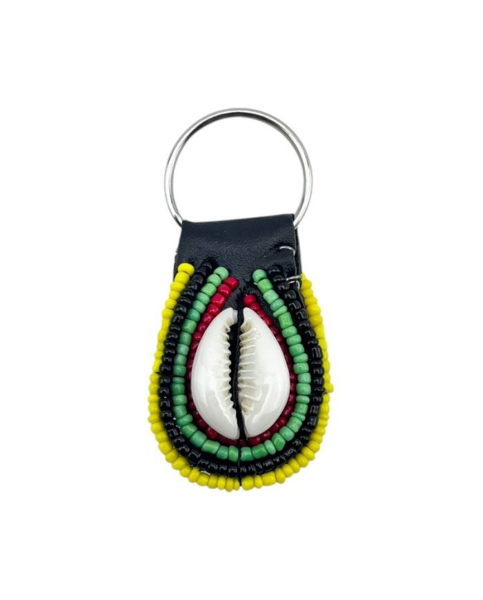 The Maasai Bead Cowrie Shell Keychain – Green is a beautiful handmade accessory celebrating African tradition. Crafted in Kenya, this teardrop-shaped black leather key tag features a central cowrie shell, a symbol of cultural richness and good fortune. It is encircled by green Maasai glass beads, accented with other bold colors such as red, yellow, or black, depending on the variation. Every keychain is hand-stitched and uniquely arranged by Maasai artisans.