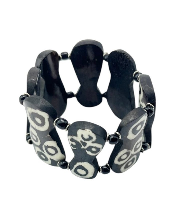 The Ufunguo Bone Bracelet is a beautifully crafted stretch bracelet made from gourd-shaped cow bone beads, each carefully dyed using the traditional wax-resist method. This technique creates a stunning contrast between the dark bone and light, intricate patterns that decorate each bead. The African bracelet’s design is enhanced with black Maasai glass beads and metal separators, which add texture and vibrancy to the piece. Ideal for those who appreciate handmade, cultural jewelry, the Ufunguo Bone Bracelet is a unique blend of African heritage and contemporary design. Comfortable and versatile, it makes a bold statement while reflecting the artistry and craftsmanship of Maasai and African traditions.