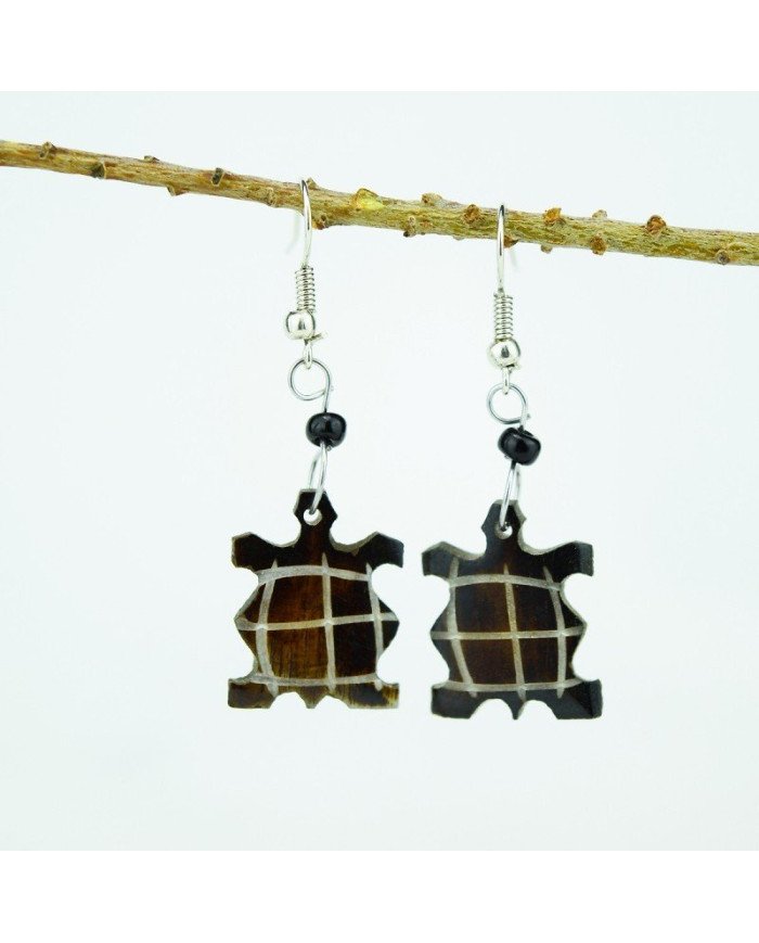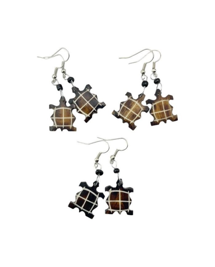 Discover our Tortoise Bone Earrings, a beautiful testament to Kenyan artistry. Hand-carved from repurposed cow bone, each earring is shaped like a tortoise, symbolizing longevity and wisdom. The rich brown dye and intricate etching create a stunning visual appeal, making these earrings a unique addition to your African jewelry collection.