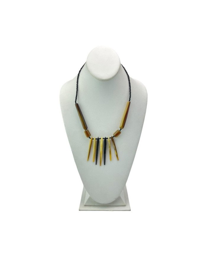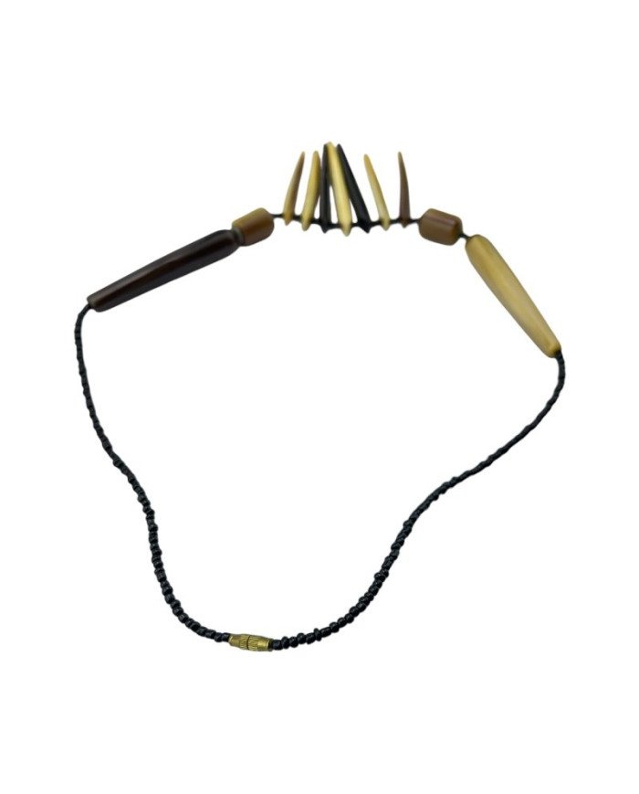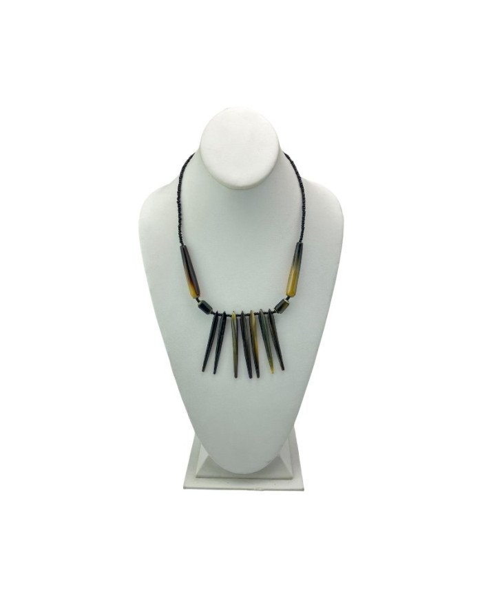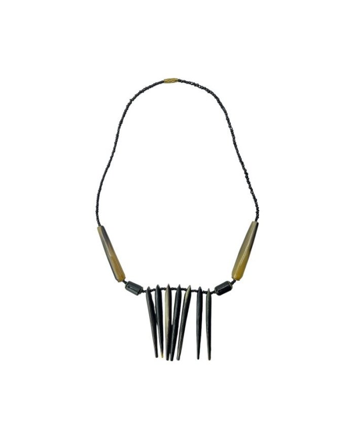 The Miiba Cow Horn Necklace is a powerful blend of African craftsmanship and bold design. This Kenyan handmade piece features sleek black Maasai beads that are complemented by smooth tubular cow horn beads for a natural, earthy touch. The centerpiece of the necklace is a dynamic cluster of cow horn spikes, carefully arranged to add texture and drama. This African necklace brings a distinctive edge to any outfit, offering a blend of tradition and modern flair. Perfect for those who appreciate unique, cultural jewelry, the Miiba Cow Horn Necklace is a statement piece that stands out with its striking design and craftsmanship.