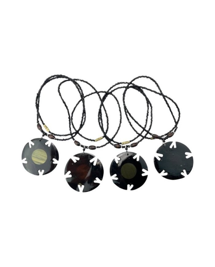 The Dira Pendant Necklace features black Maasai beads, two wooden beads, and a circular cow horn pendant dyed dark brown with a natural center. The pendant is adorned with a notched design along the edges. Available in both light and dark versions, this African necklace is a unique, nature-inspired piece.