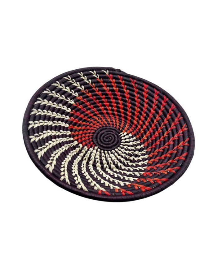 The Savanna Ember Weave Basket is a striking handwoven piece crafted by Ugandan artisans using natural raffia fibers. Its rich maroon base sets the stage for a vivid spiral design created from alternating natural and red-orange strands, giving the basket a warm, glowing appearance reminiscent of embers or a sunset.
