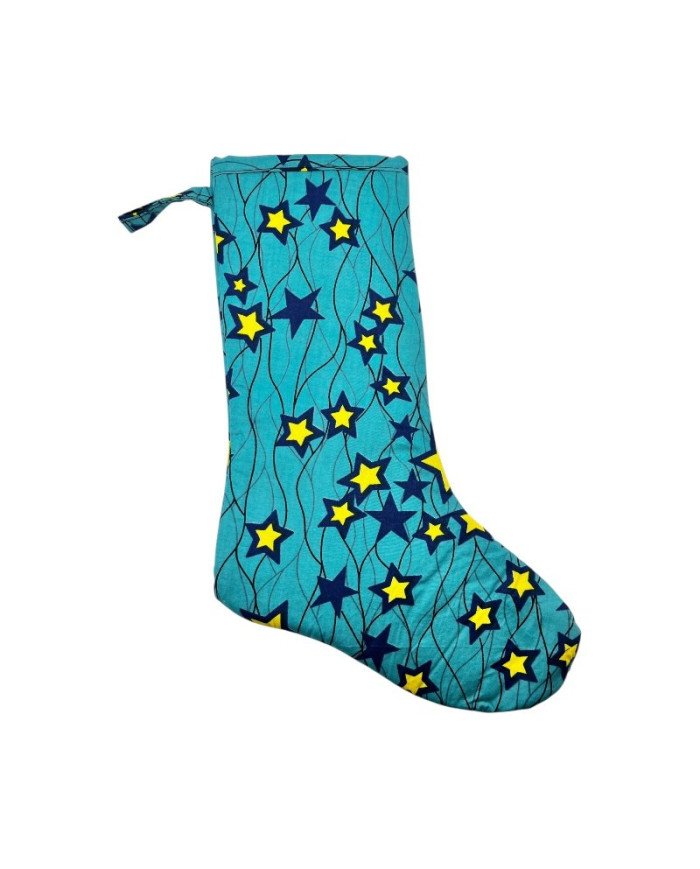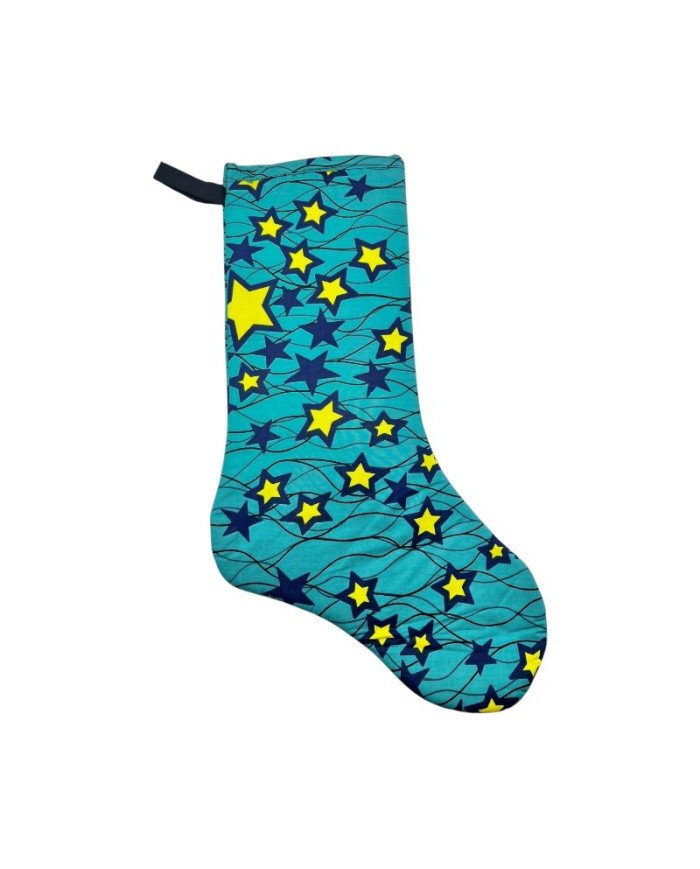 Bring a playful and festive flair to your holiday décor with our Large Kitenge Christmas Stocking – Stars. Handmade in Kenya from authentic kitenge fabric, this stocking features a charming pattern of wavy lines and stars in vibrant colors, making each piece a joyful addition to your celebrations.