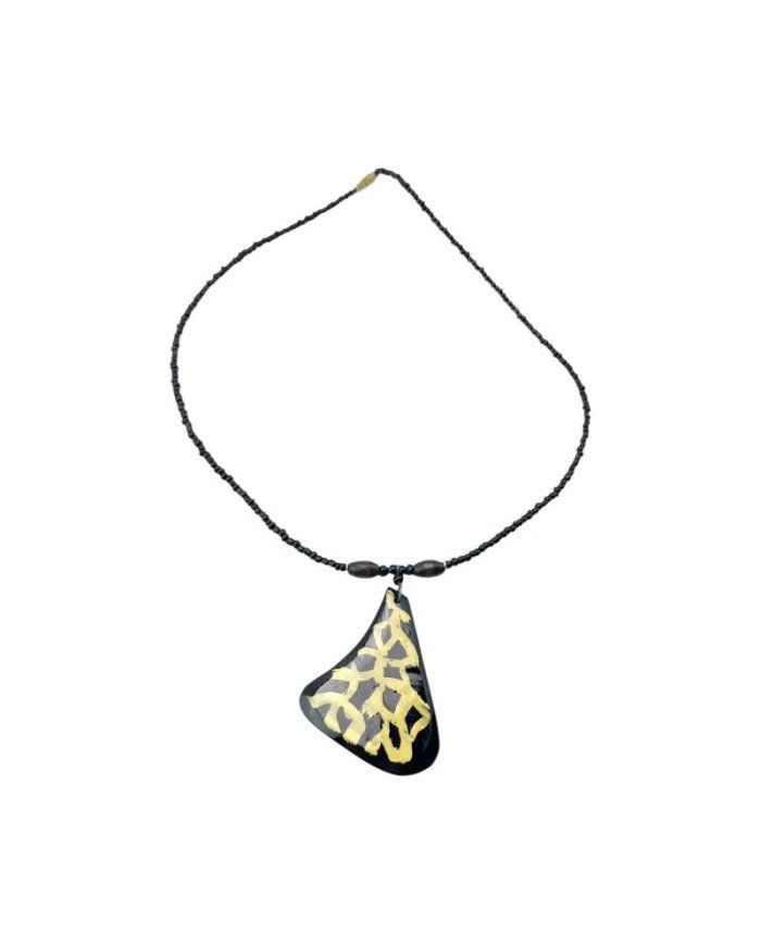 The Twiga Cow Horn Pendant Necklace is a captivating piece of African jewelry that showcases the beauty of African craftsmanship. Featuring black Maasai beads and wooden beads on either side, this necklace highlights a triangular-shaped cow horn pendant adorned with a striking giraffe print design. The unique pendant adds a touch of wildlife-inspired elegance, while the combination of Maasai beads and wood provides an earthy, natural feel. Perfect for those who love statement jewelry with cultural significance, the Twiga Cow Horn Pendant Necklace blends traditional African elements with modern style, making it a standout piece in any collection.