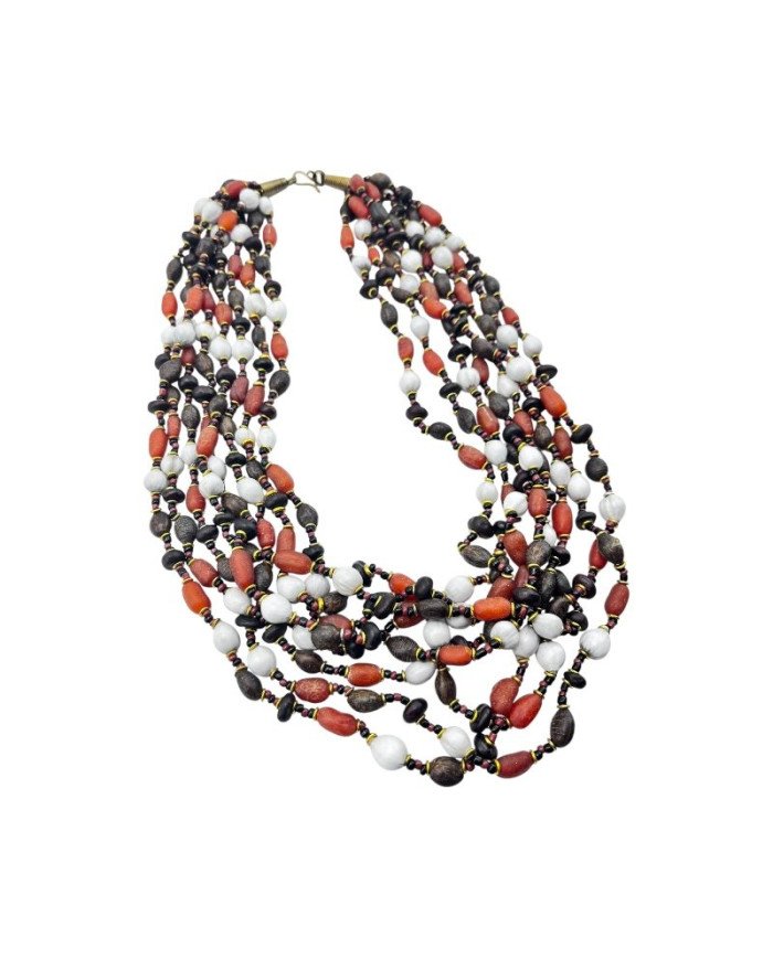 Each strand features a thoughtful blend of white imfibinga, brown wiio, orange river amber, and cawwa seed beads, interspersed with Maasai glass beads and brass spacers for added shine and contrast. The result is a vibrant yet balanced piece that embodies both cultural heritage and contemporary style.