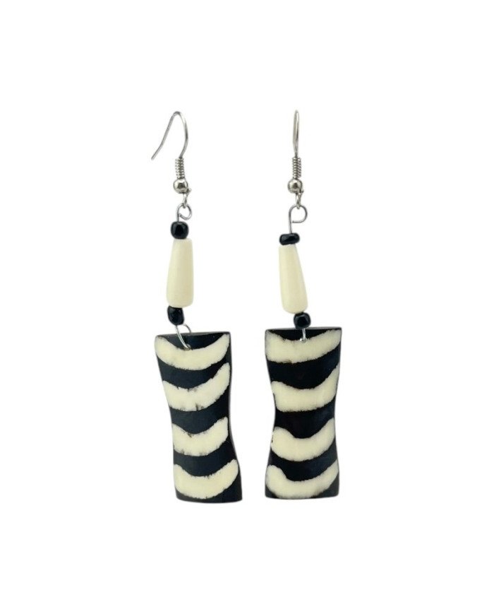 The Mistari Batik Print Bone Earrings are a beautiful and intricate blend of traditional African craftsmanship and modern design. These African earrings feature a small white cow bone tube bead, accented with black Maasai beads at the top and bottom. The focal point of the design is a batik print cow bone dangle, decorated with a bold striped pattern. Handcrafted with care by skilled Kenyan artisans, these earrings offer a striking combination of natural materials, vibrant colors, and cultural significance. Perfect for adding a touch of earthy elegance and unique style to any outfit.