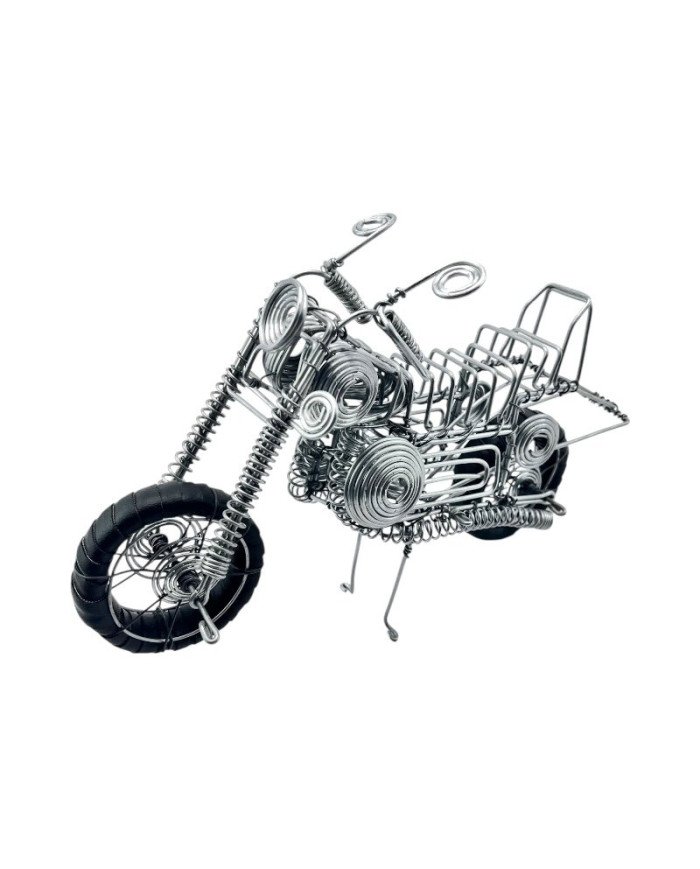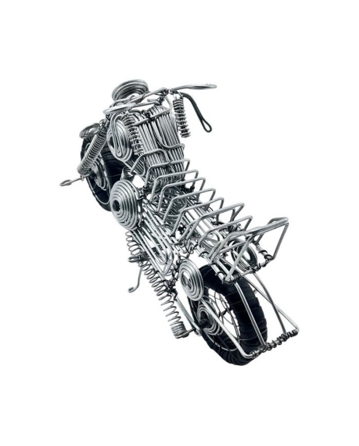 This Handmade Wire Motorcycle is a striking piece of functional art—crafted entirely from recycled metal wire and tire inner tube by talented artisans in Kenya. Designed with incredible attention to detail, it features moving wheels, a working kickstand, and realistic touches that bring it to life. Whether displayed on a desk, shelf, or man cave, it makes an ideal gift for motorcycle enthusiasts, lovers of eco-friendly art, or anyone who appreciates handmade craftsmanship. Sustainable, stylish, and full of character, each piece is a unique tribute to creativity and reuse.