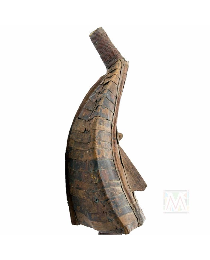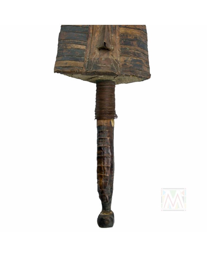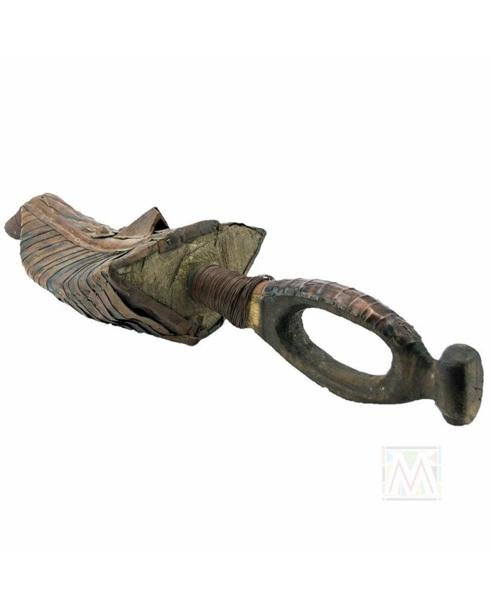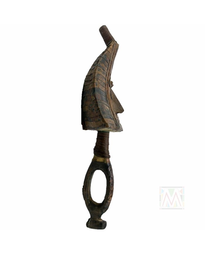 Upon the death of a chief, initiates collect relics from the deceased, adorning them with metal and magical powders. These sacred items, along with charms and other potent substances, are stored in woven rattan baskets topped with wooden reliquary figures, often plated with thin copper or brass. Each Mahongwe clan possesses a reliquary housed at the back of the chief's hut. These figures are integral to communal rituals, where the clan chief dances while holding the reliquary.