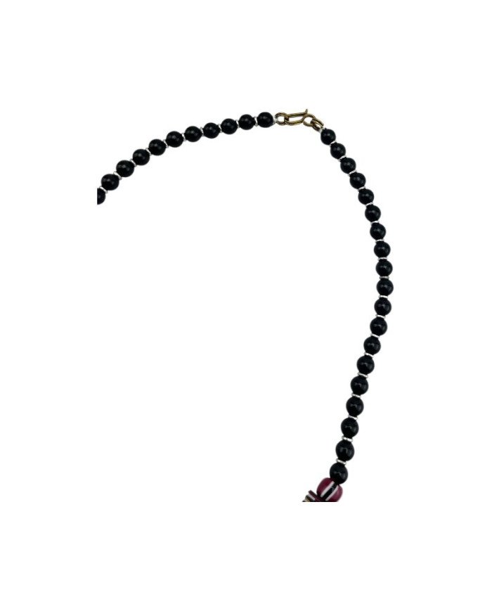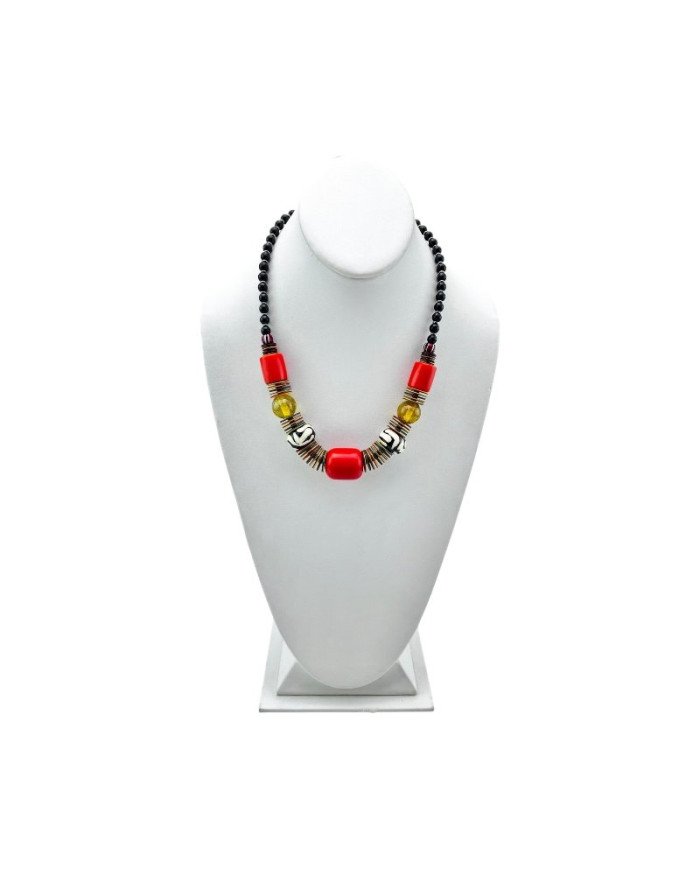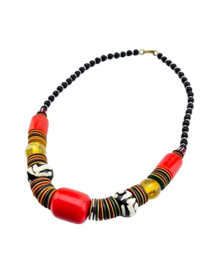 The Umoja Necklace is a bold celebration of unity and African artistry. Handcrafted in Kenya with an eclectic mix of standout batik bone beads, colorful resin beads, sleek black glass beads, metal spacers, and striking plastic disks in traditional Rasta colors (yellow, red, and green), this statement piece of African jewelry embodies culture and craftsmanship. Perfect for those who appreciate Afrocentric fashion and ethical jewelry.