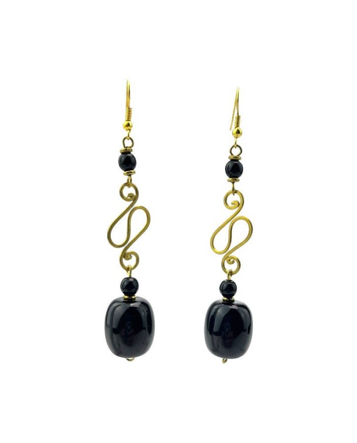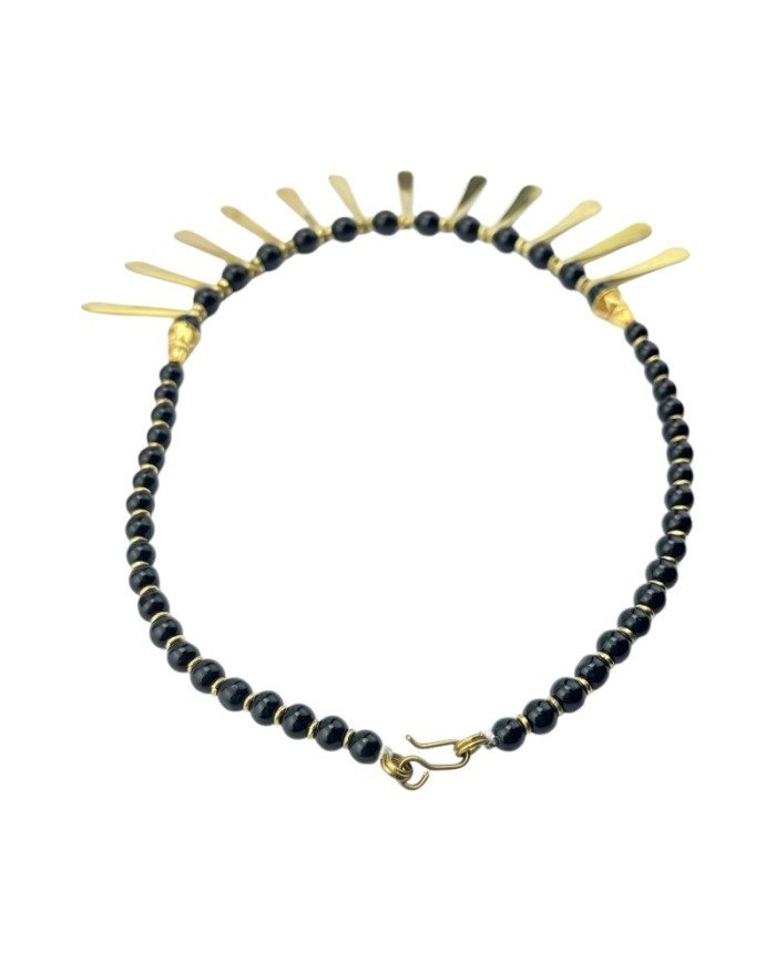 The Desert Glow Set captures the warmth and elegance of sunlit landscapes through artisan-crafted design. The vibrant orange jute clutch features a round Maasai glass bead accent in orange and black, blending texture with cultural artistry. The Ndoto Resin Earrings pair sleek black resin beads with hammered brass links, creating a bold yet refined silhouette. Completing the look, the Brass Spokes Sunburst Necklace radiates with polished brass spokes highlighted by glossy black beads for striking contrast. Each piece is handmade by skilled artisans, offering timeless style with a touch of global sophistication.