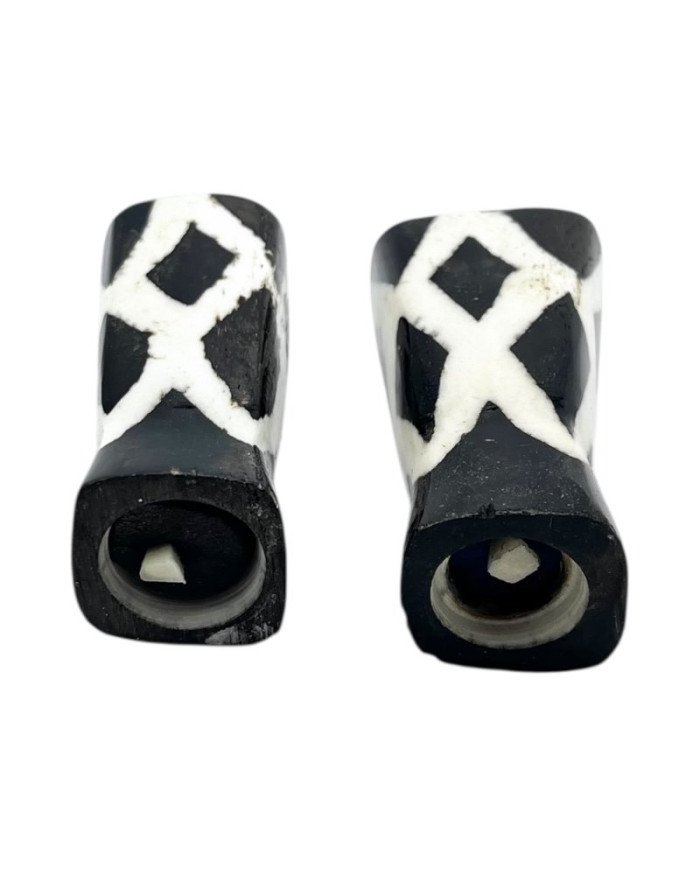 Add a bold, artisan-crafted touch to your dining table with our Mini Savanna Lattice Shakers. Handcarved by skilled East African artisans using sustainably sourced bone, each shaker showcases a striking black-and-white lattice motif created through traditional batik etching. The angular silhouette gives them a modern sculptural feel, while the natural wooden tops provide a warm contrast and house the shaker holes.