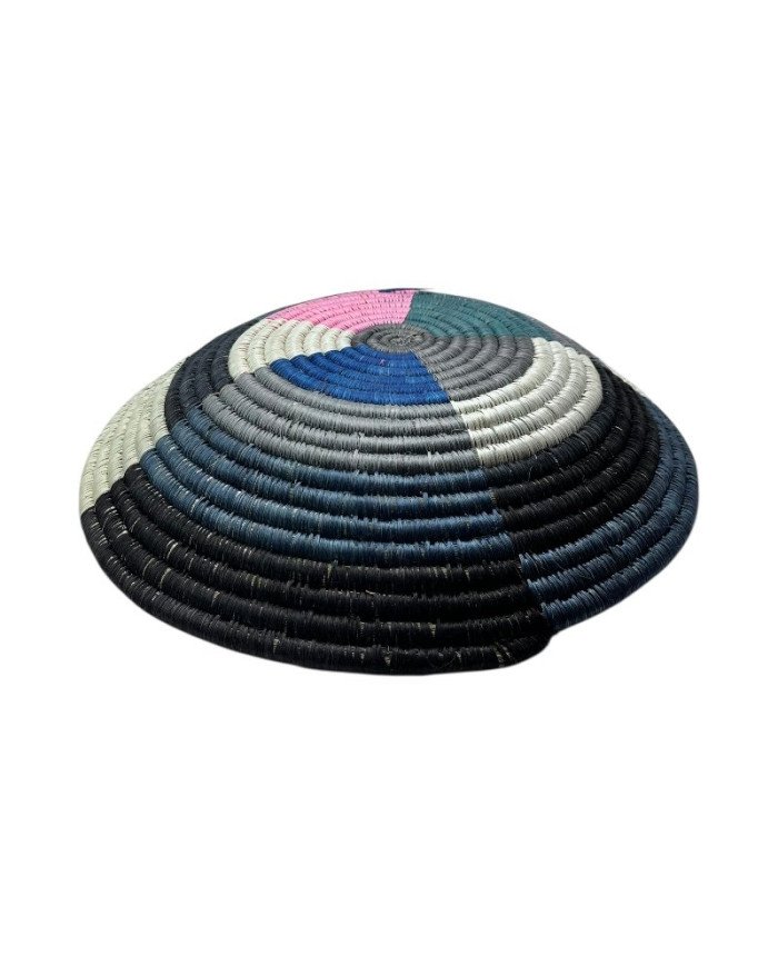 Celebrate vibrant craftsmanship with the Spectrum Weave Basket, handwoven by skilled Rwandan artisans using sustainably sourced sisal. This striking basket features sections, each subdivided into vertical bands showcasing a dynamic mix of black, gray, blue, green, pink, and white. The geometric, multi-color design makes it a bold statement piece—perfect for wall décor, tabletop display, or functional storage.