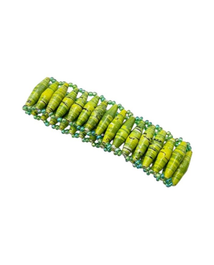 The Karatasi Stretch Bracelet - Green is a one-of-a-kind piece of African jewelry crafted from hand-rolled paper beads, made from recycled materials such as old calendars and brochures. These paper beads come in varying shades of green, creating a rich, layered look. Each bracelet is unique, with no two looking alike. The design is complemented by Maasai beads, adding an authentic African touch. Strung with stretchy cord, this bracelet is both comfortable and versatile, stretching to fit any wrist size. Perfect for eco-conscious fashion lovers, the Karatasi Stretch Bracelet blends sustainability with vibrant color and cultural craftsmanship.