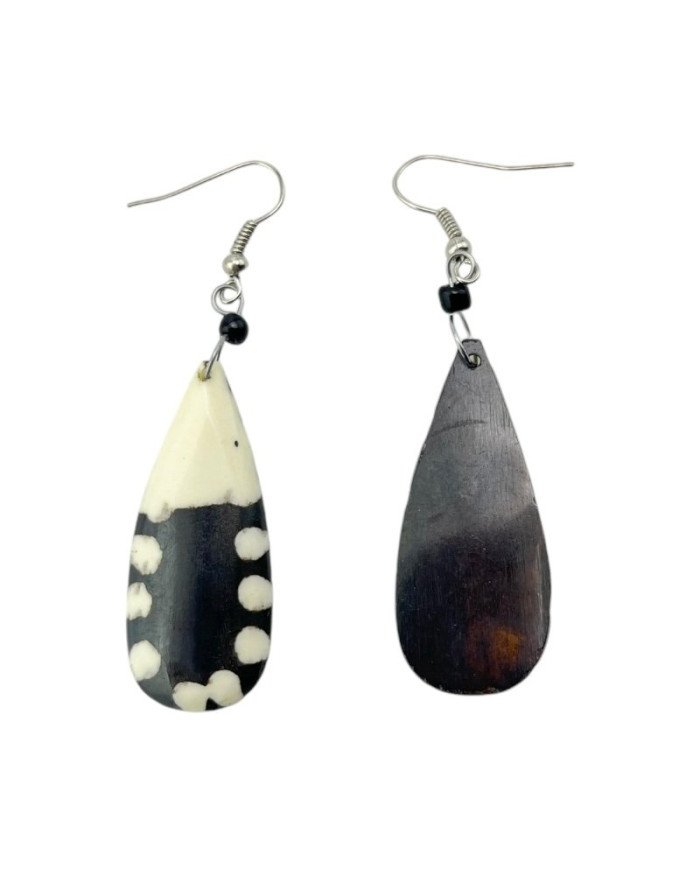 Introducing the Mdudu Batik Bone Earrings, a stunning fusion of cultural heritage and contemporary design. Handcrafted from mudcloth batik-dyed cow bone, these African earrings showcase a unique pattern adorned with playful dots around the perimeter. Each piece reflects the rich artistry and craftsmanship of Kenyan artisans, making them a standout accessory for any occasion. Lightweight and comfortable, the Mdudu Earrings are perfect for both everyday wear and special events. Embrace a touch of elegance and tradition with this exquisite piece of African jewelry that celebrate the beauty of African artistry.