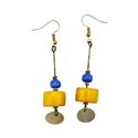 Bring color and pattern to your look with the Mchoro Earrings, a beautiful variation of the classic Manjano design. Handmade in Kenya, these earrings feature a sleek brass rod accented with a multicolored chevron African glass bead, leading to a golden-yellow resin cylinder. A delicate brass circle dangles below, adding movement and elegance.