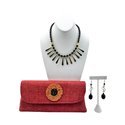The Autumn Sands Ensemble blends earthy textures and golden accents for a timeless, artisan-crafted look. The brown jute clutch features a circular Maasai glass bead accent in shades of brown, yellow, black, and clear for a subtle yet striking detail. The coordinating Kutafakari Brown Necklace is crafted with brown coconut shell disc beads, Maasai glass beads in matching tones, and brass spiral accents for a warm, layered style. Completing the set, matching Brown Copper Swirl Coconut Shell Earrings feature coconut shell discs, brass spirals, and Maasai glass bead accents for a cohesive finish. Each piece is handmade by skilled artisans, showcasing natural materials, sustainable craftsmanship, and global design inspiration.