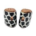 African hand-carved bone salt and pepper shakers featuring a striking batik pattern of white tapered dash marks arranged in angled rows against a deep black background. Each mark is applied through traditional wax-resist dyeing, creating an organic, rhythmic design that wraps naturally around the bone. Smooth wooden tops and bases add warmth and contrast, while a small side opening with a carved wooden plug allows for easy filling. These handmade shakers bring a beautiful blend of African craftsmanship and functional design to your kitchen or table.